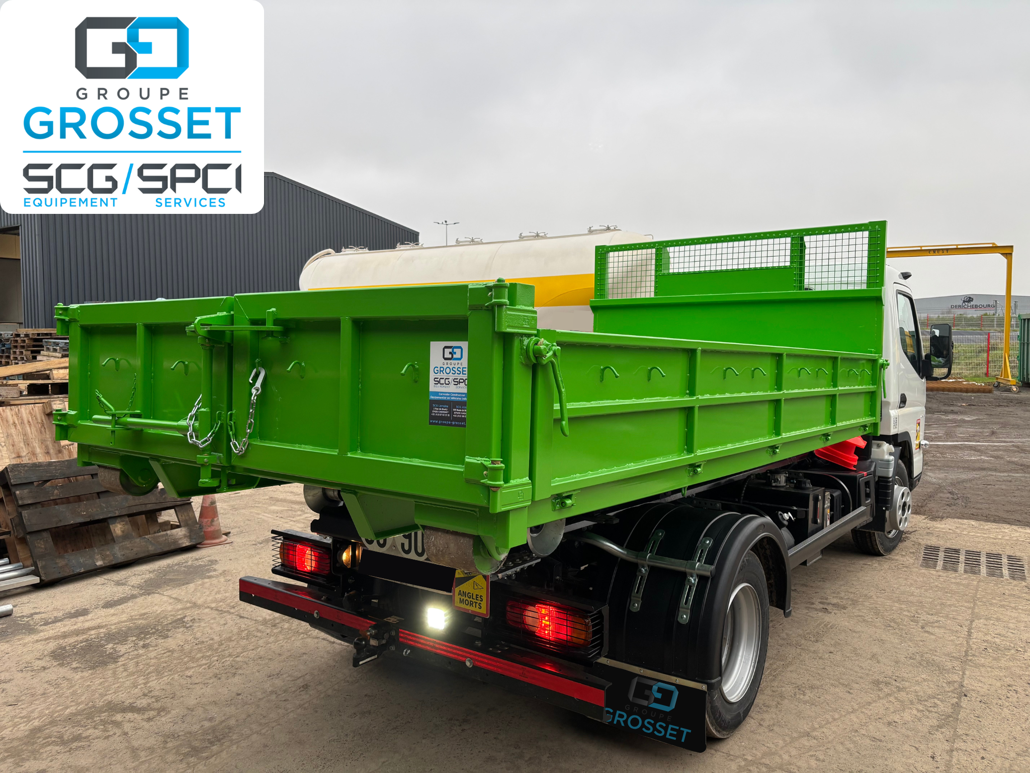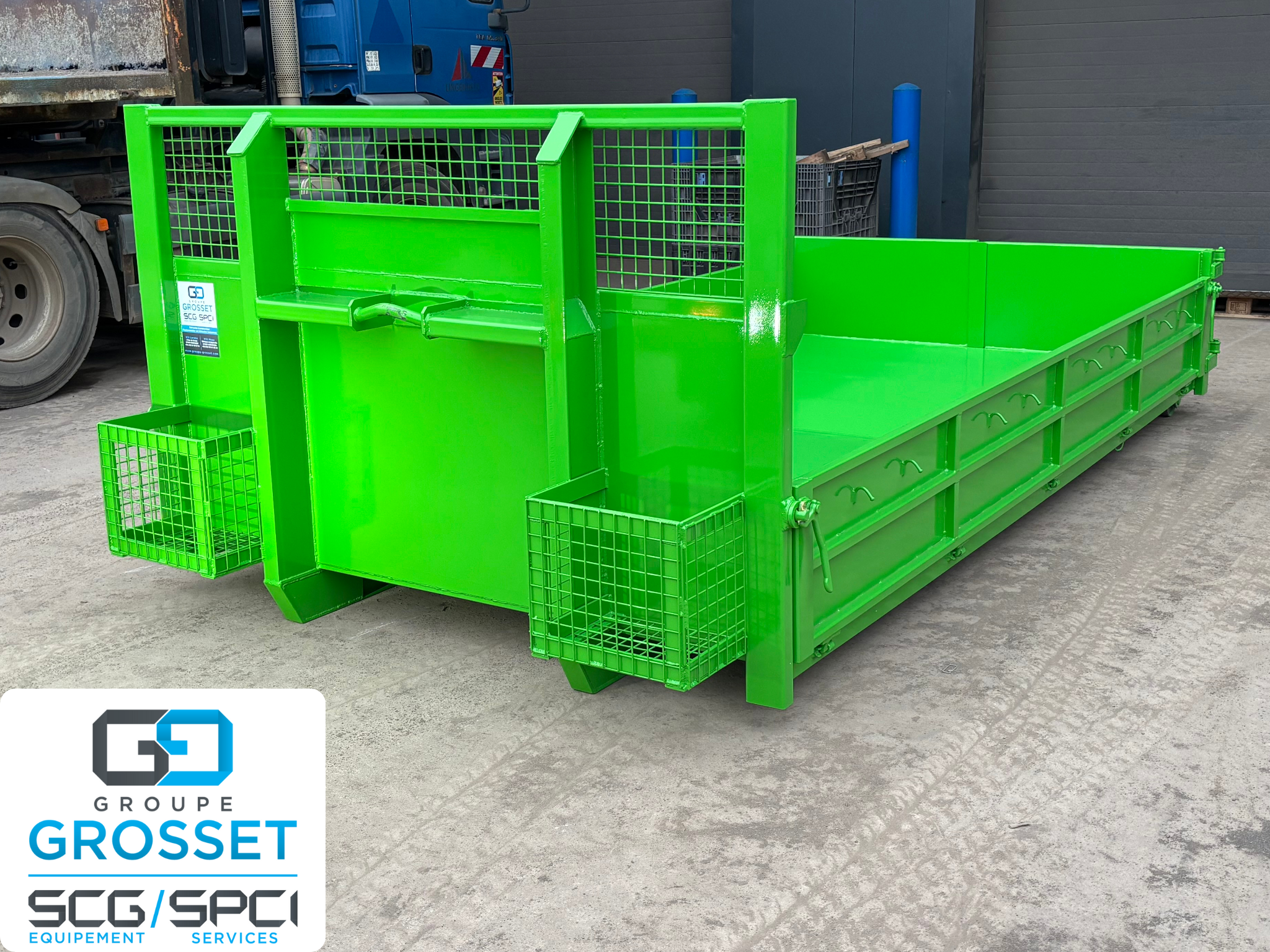 Livraison d’un caisson ampliroll classe 1 de 3M3 fabriqué dans nos locaux à Cheminot, avec ridelles rabattables, réhausse grillagé et portes bidons sur face avant.