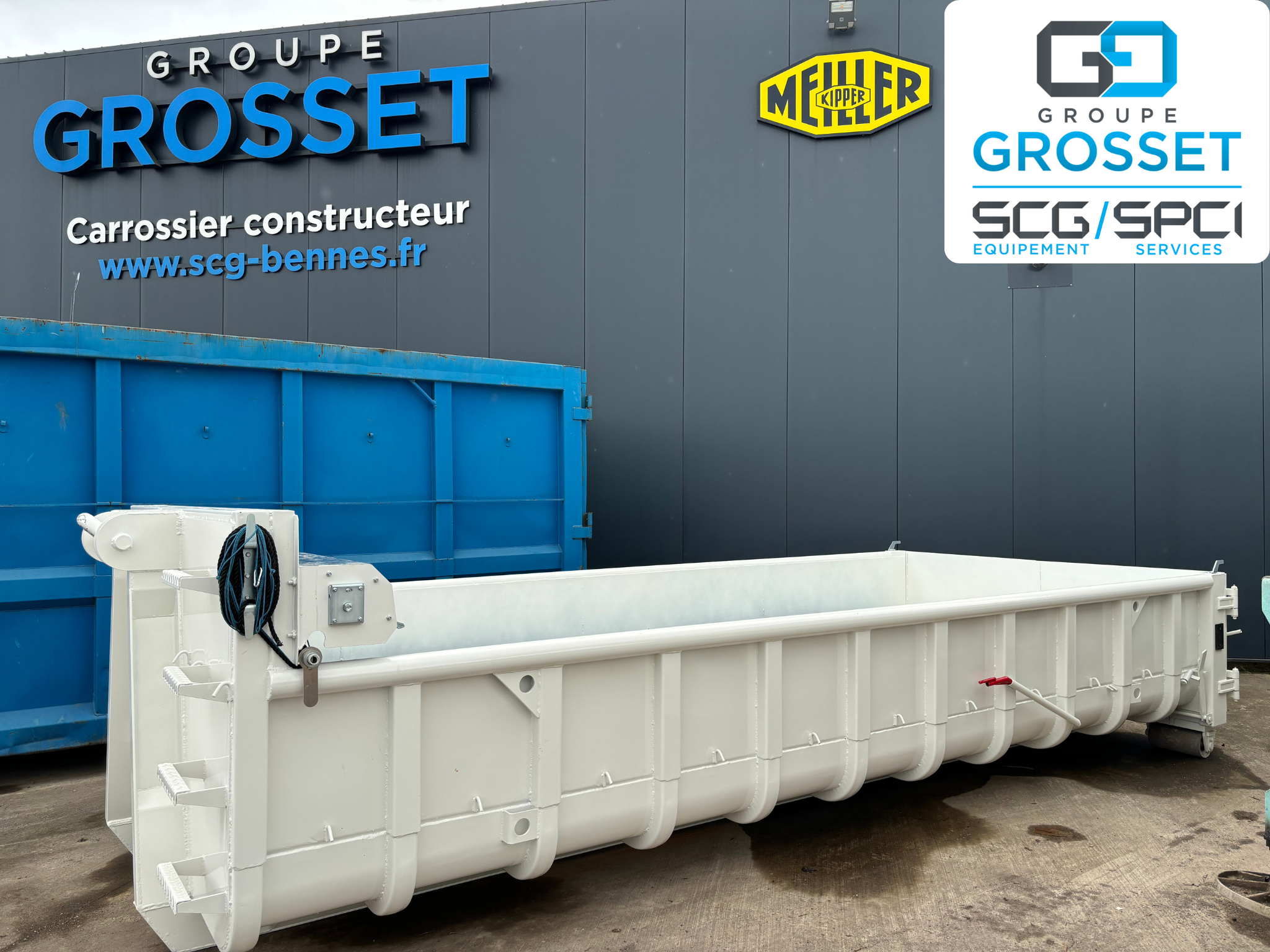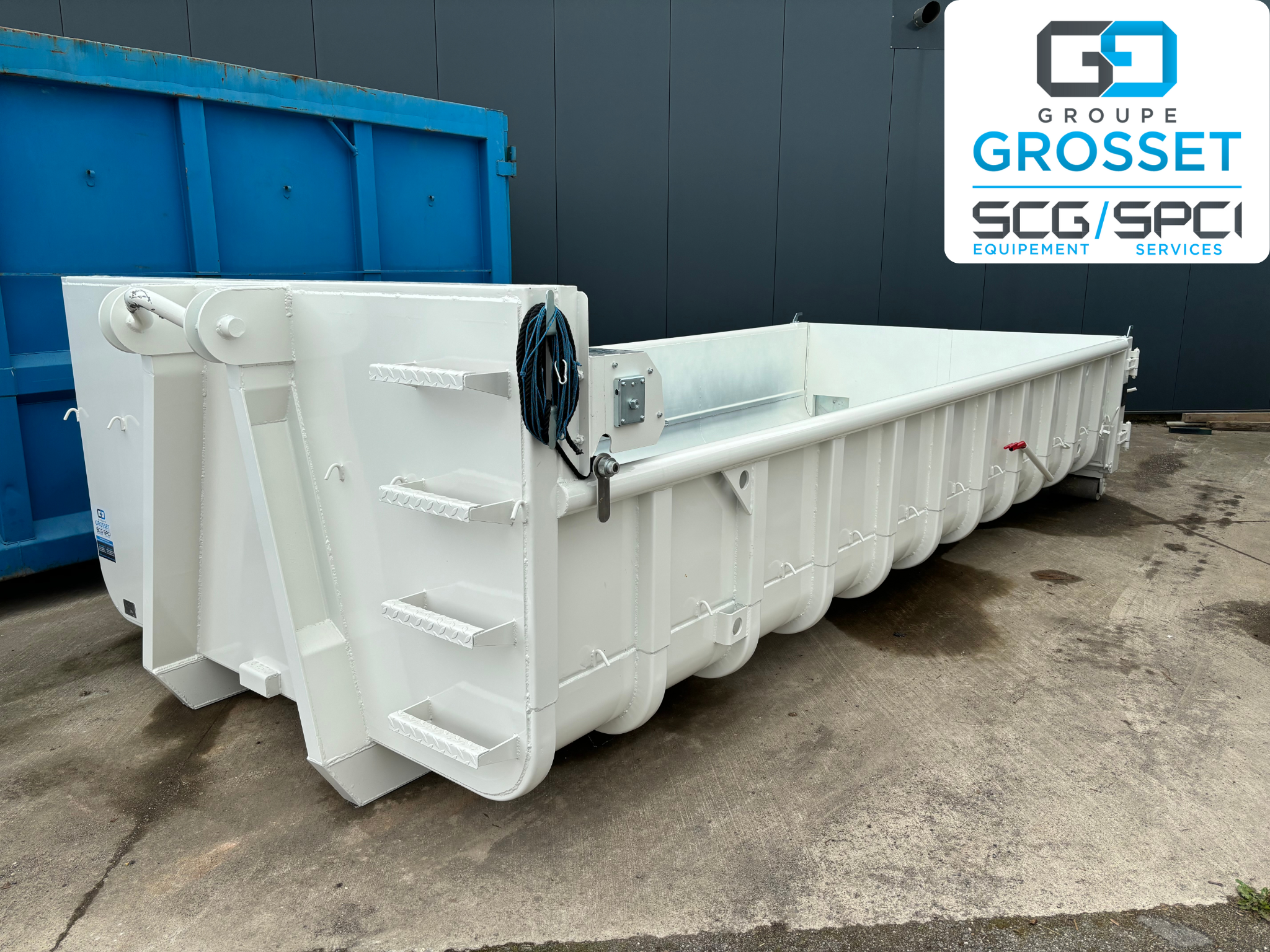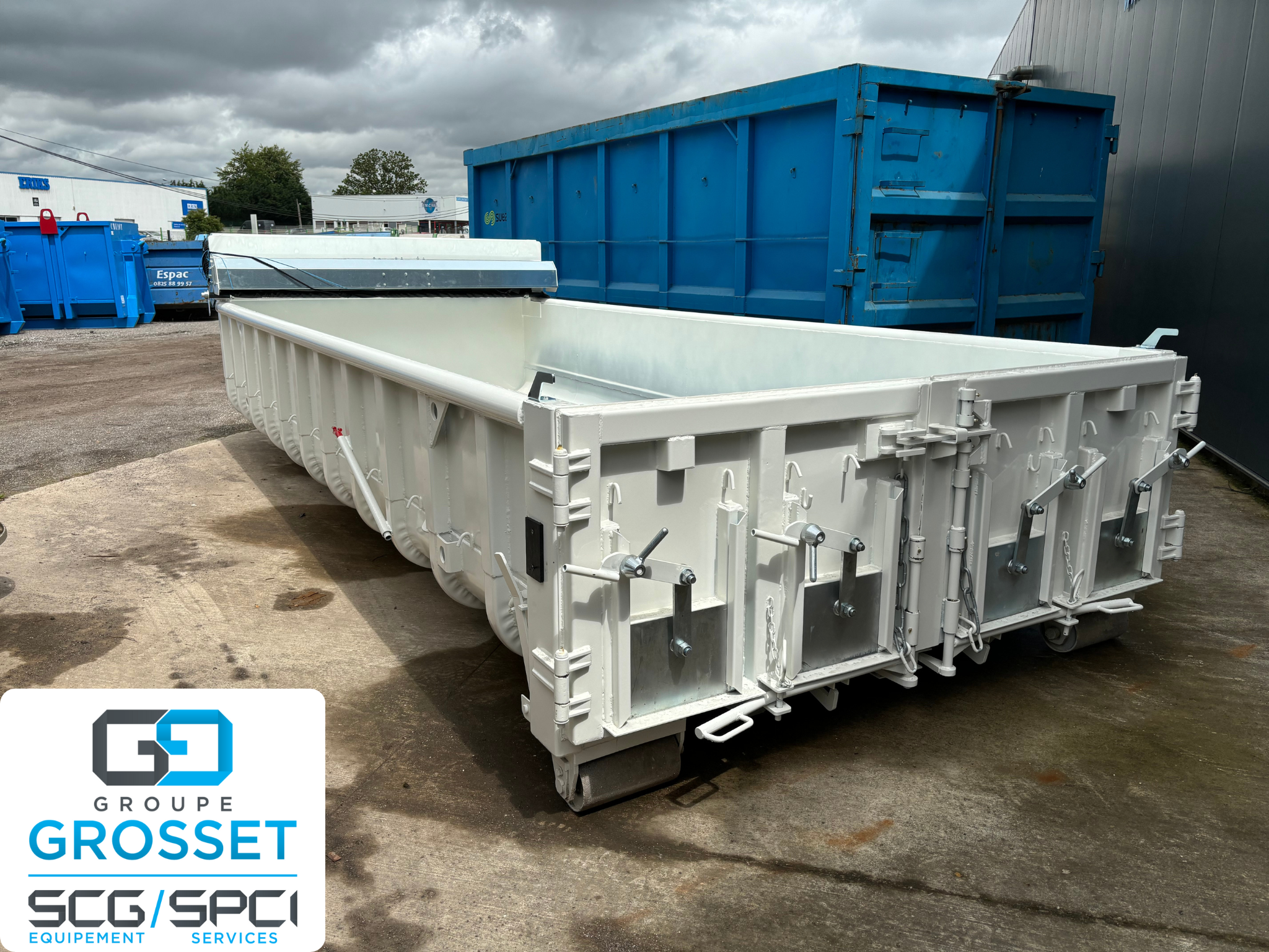 Livraison d’un caisson ampliroll renforcé de 10M3 équipé de 4 trappes à bitumes ainsi qu’un bâchage manuel type Tell-one Cramaro en tissu technique pour enrobé.